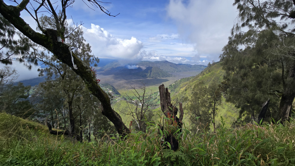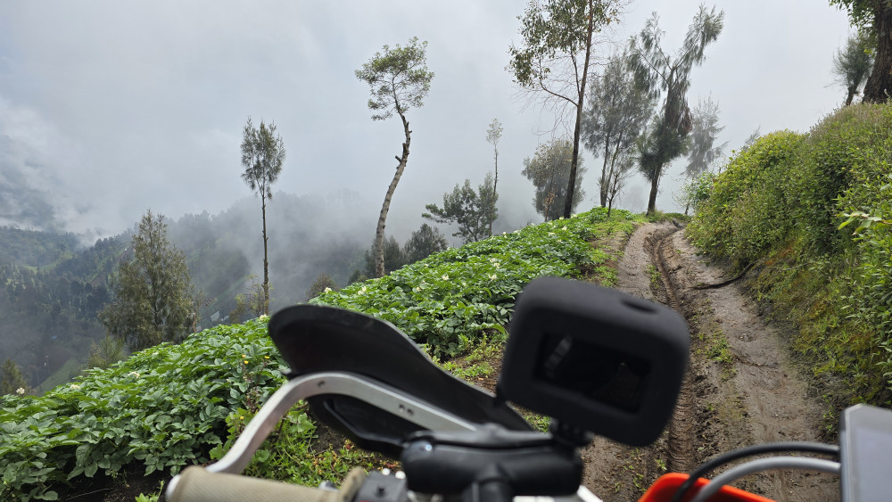 Beautiful views over the Bromo crater then single trail through high altitude vegetable gardens and forest all the way to Desa Sukapura