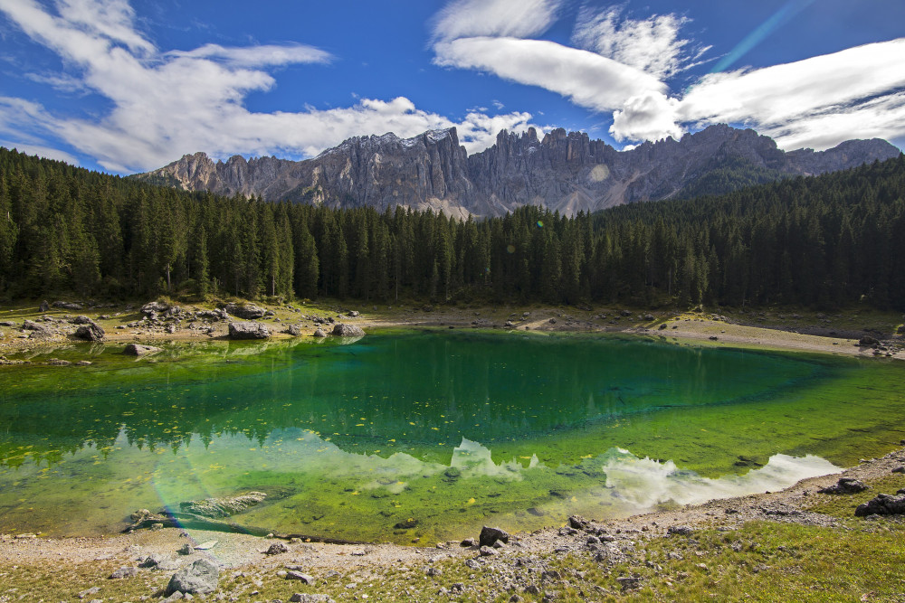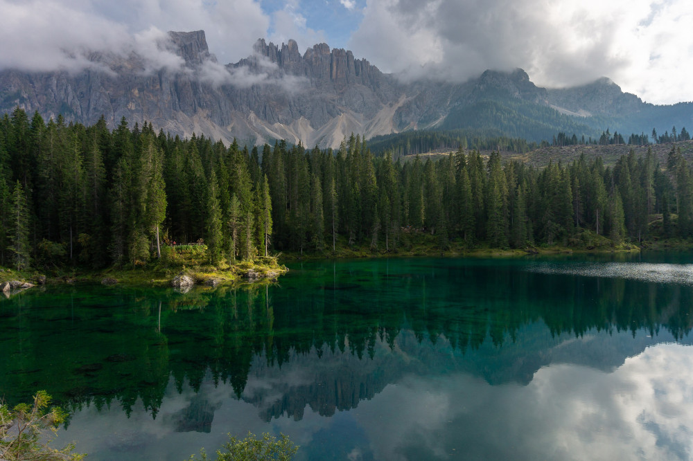 Lake Carezza (Italian: Lago di Carezza; German: Karersee) is a small alpine lake in the Dolomites in South Tyrol, Italy. It is known for its wonderful colors and its view of the Latemar mountain range.