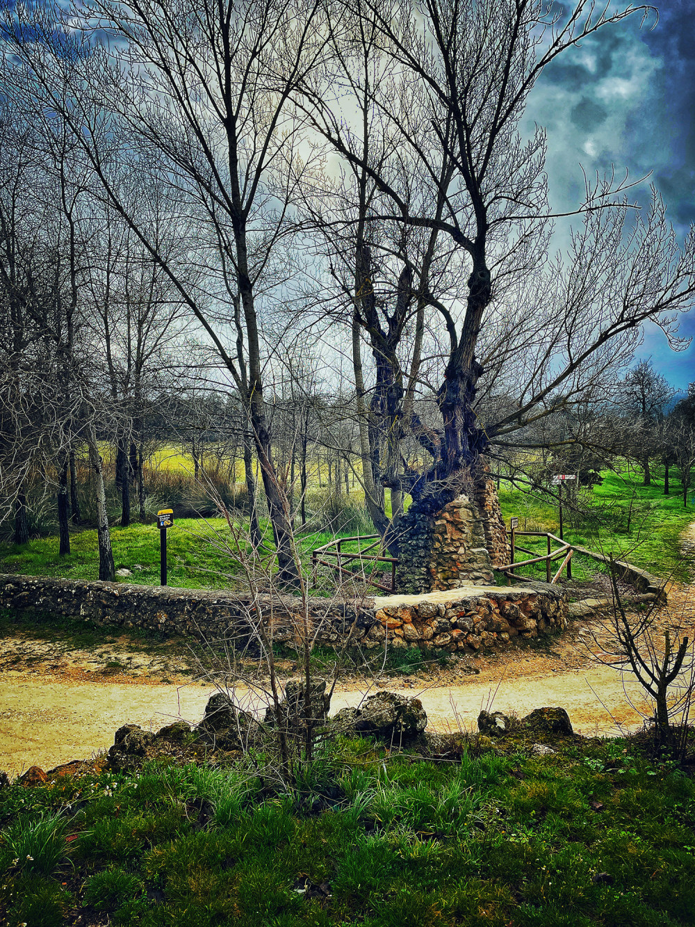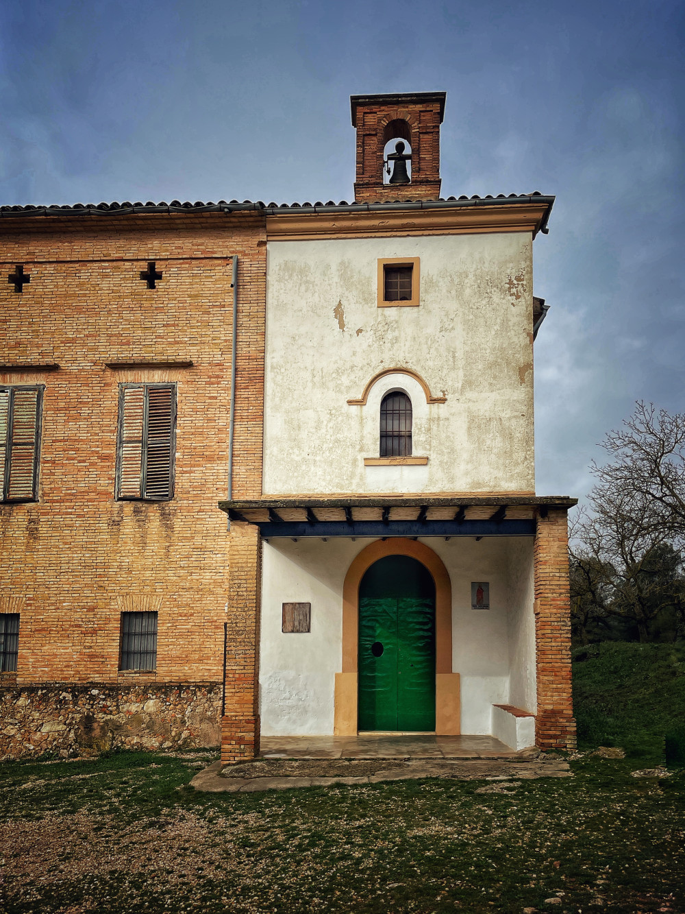 Casa grande de campo junto con la Ermita de Santa Barbara, Font del Pla (fuente) y Chopo centenario.